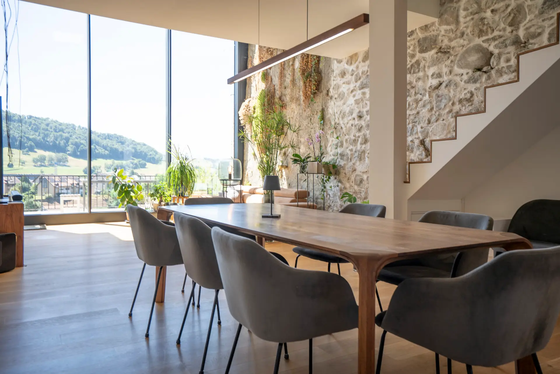 Au coeur de cette réalisation, une majestueuse baie vitrée de environ six mètres de hauteur s’élève comme un tableau vivant, encadrant avec élégance un panorama exceptionnel sur les Alpes et la campagne environnante.